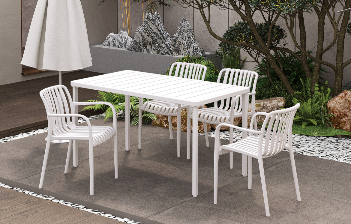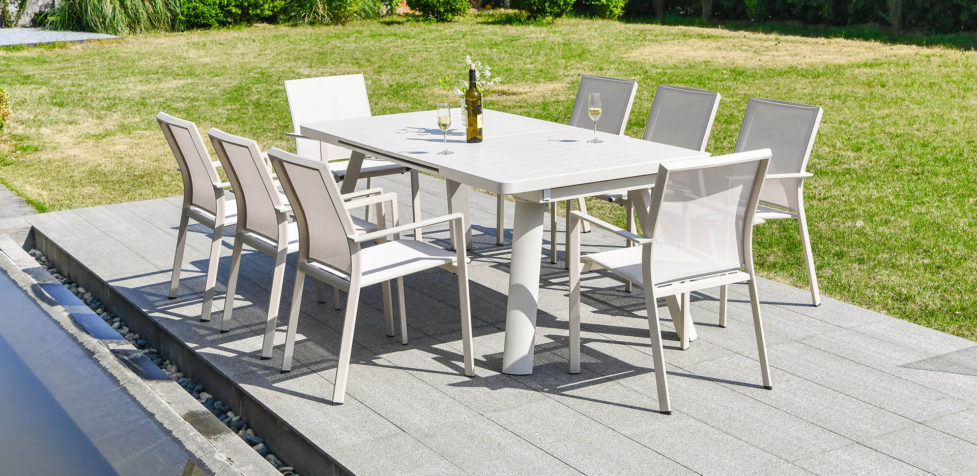 This contemporary collection features a generous auto-matic extended dining table and armchairs, blending a bright white frame with breathable, light grey textilene seating with teak armrest for a look that is both elegant and inviting.