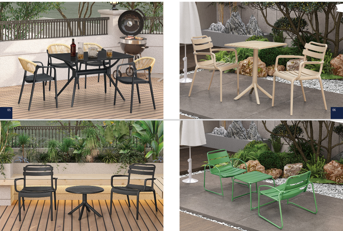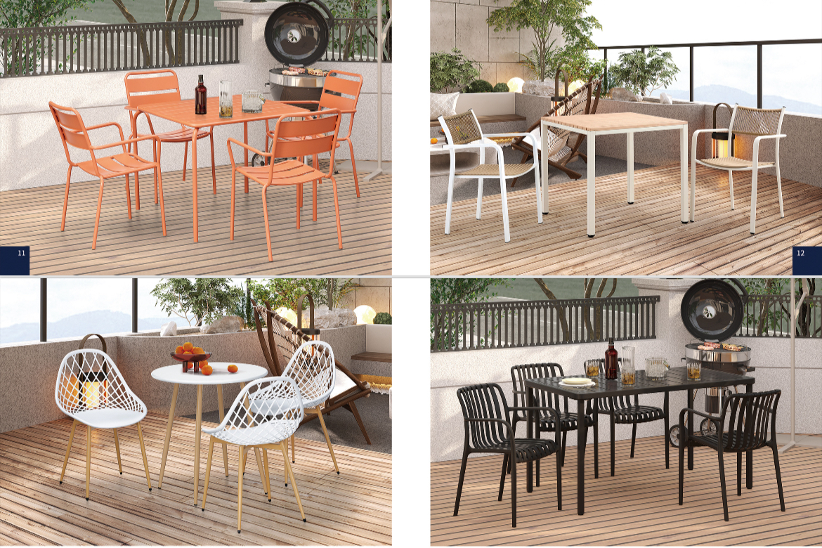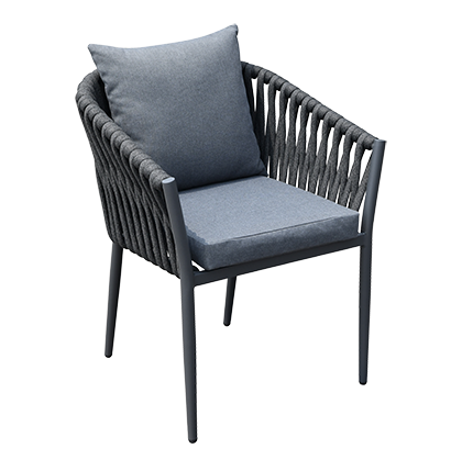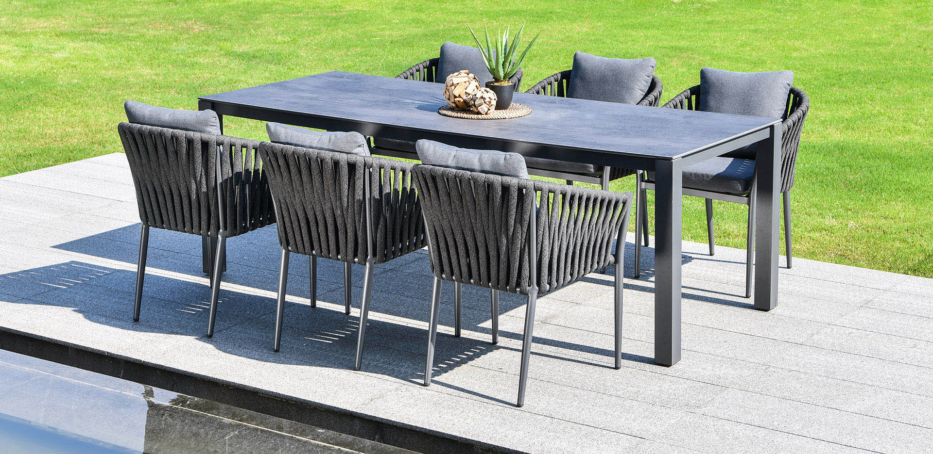This contemporary collection features durable tables with a ceramic glass-look top and sleek, dark aluminum frame, perfectly paired with a stylishly woven rope design offers a modern aesthetic that complements any outdoor decor.