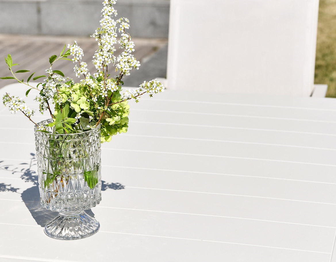Handcrafted Aluminum and All-Weather PolysterInspired by Modernism, the Luzy collection is simple, crisp and subtly elegant. Tabletops are avaible in printed glass with marble finishing or full aluminum slats.