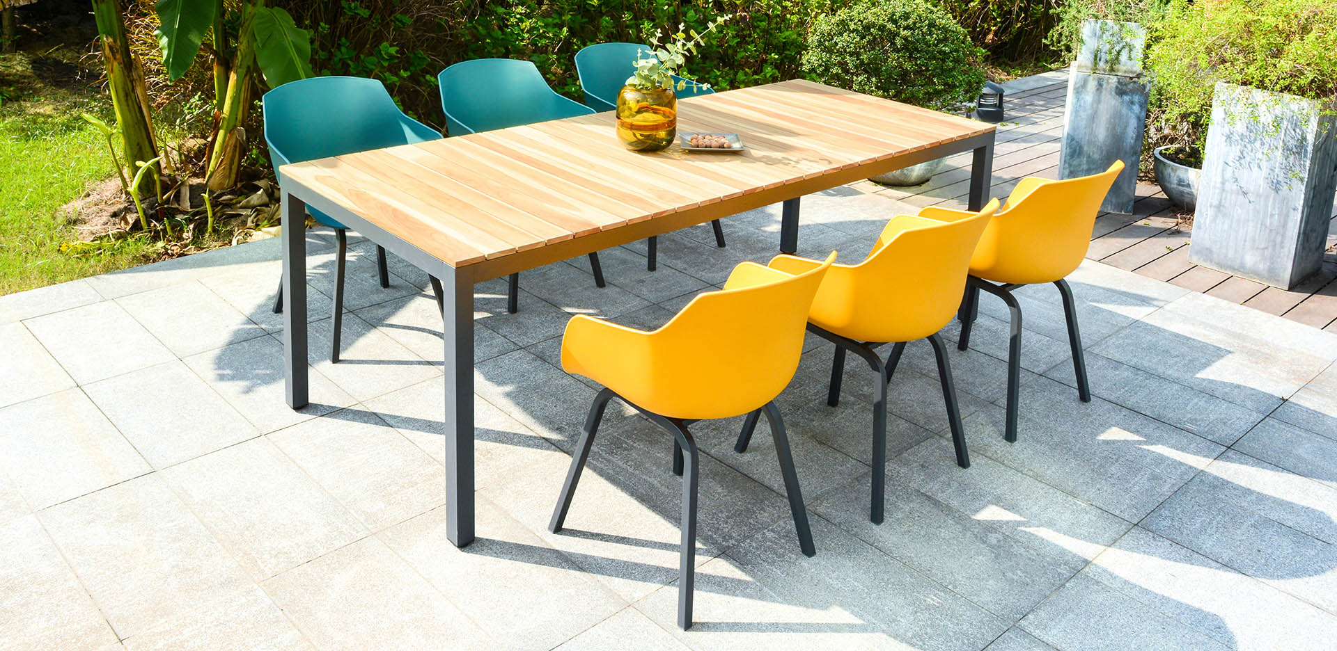 This range is designed to blend the timeless warmth of teak wood/ durable round ceramic glass table top with a fun, modern aesthetic, creating the ultimate gathering spot for relaxation and entertainment.