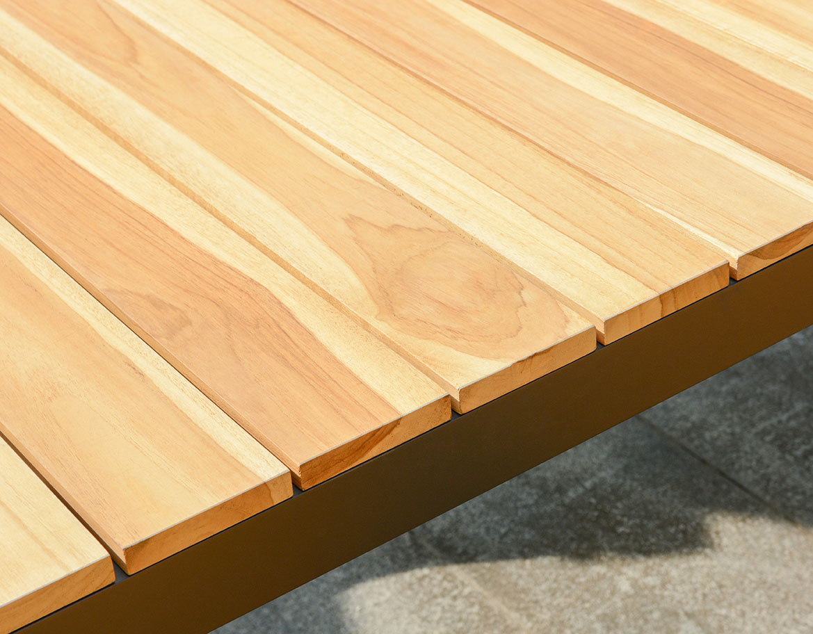 The sleek, dark aluminum frame with warm, teak armrest offers a modern aesthetic that complements any outdoor decor. The plush, neutral-toned cushions offer exceptional comfort and can withstand the elements.